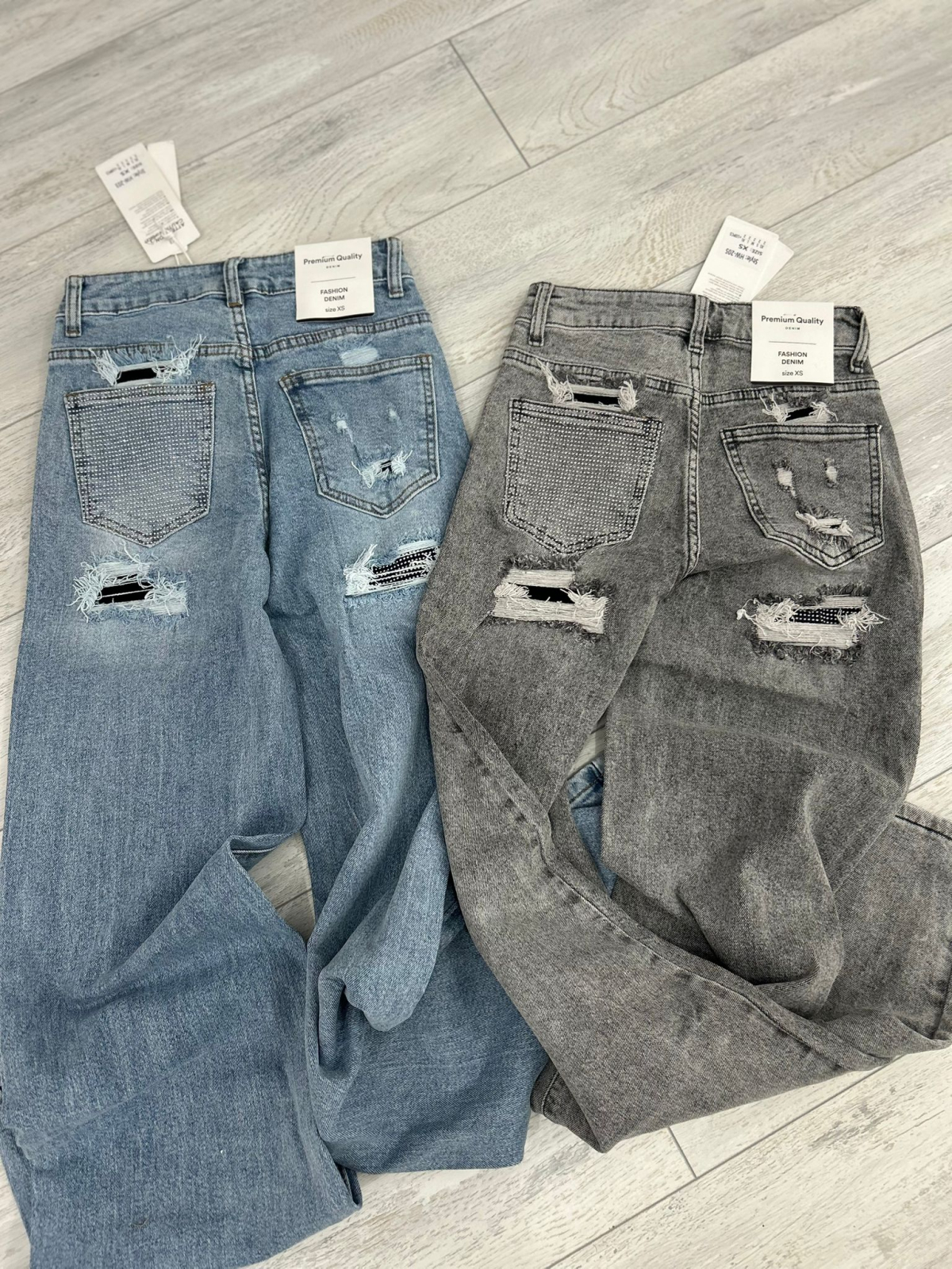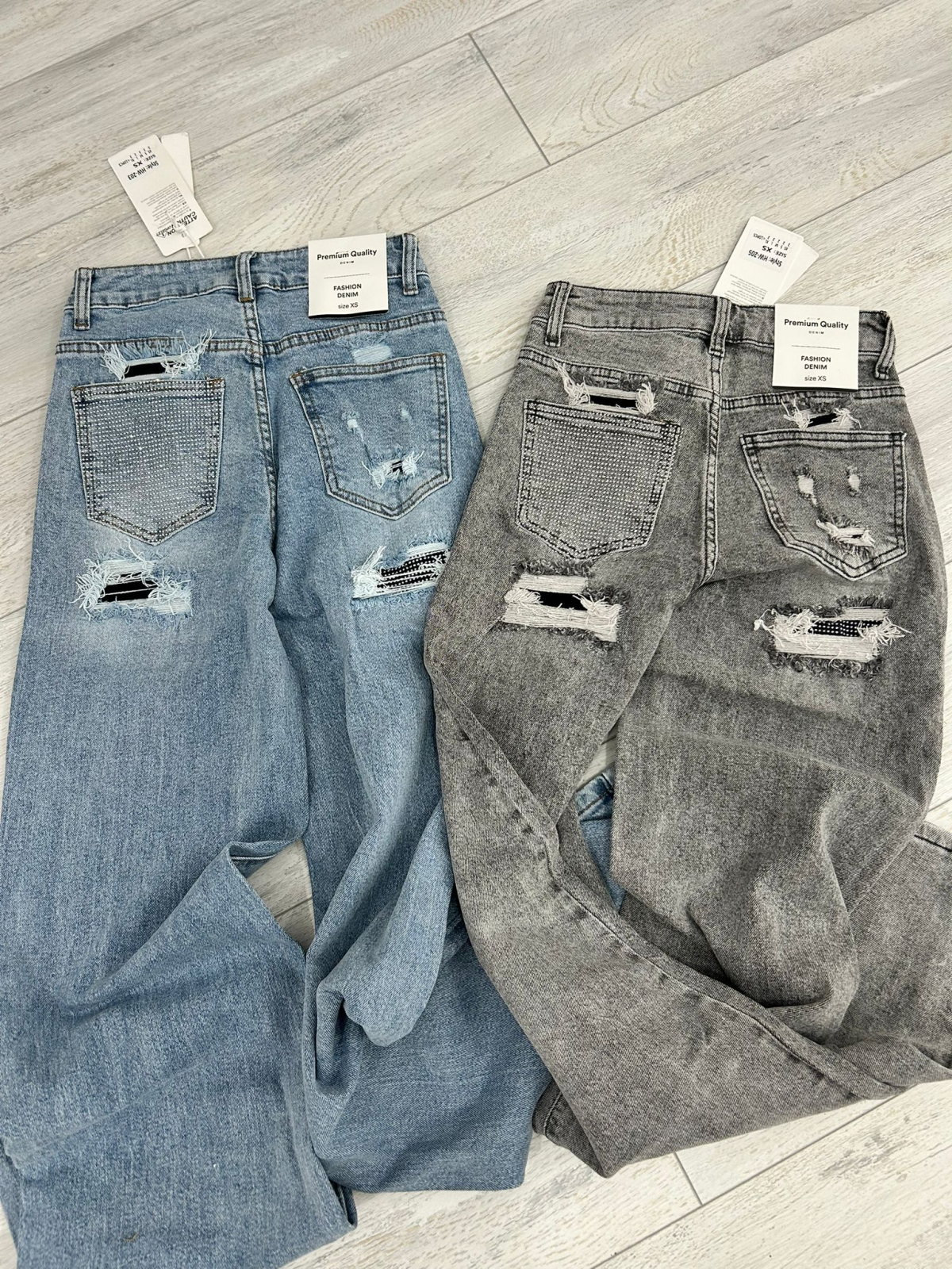 Blugi accesorizați pe buzunarul din spate cu strasuri.